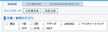 ボタンを1クリックするだけで大型優良株・高配当株が検索できるクイックサーチ機能付き。市場・投資金額・指標・業種カテゴリなどからお好みの銘柄を絞り込むことができます。