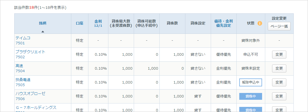 ※貸株一覧の表示件数を変更することで、最大100銘柄まで一括で変更が可能です。