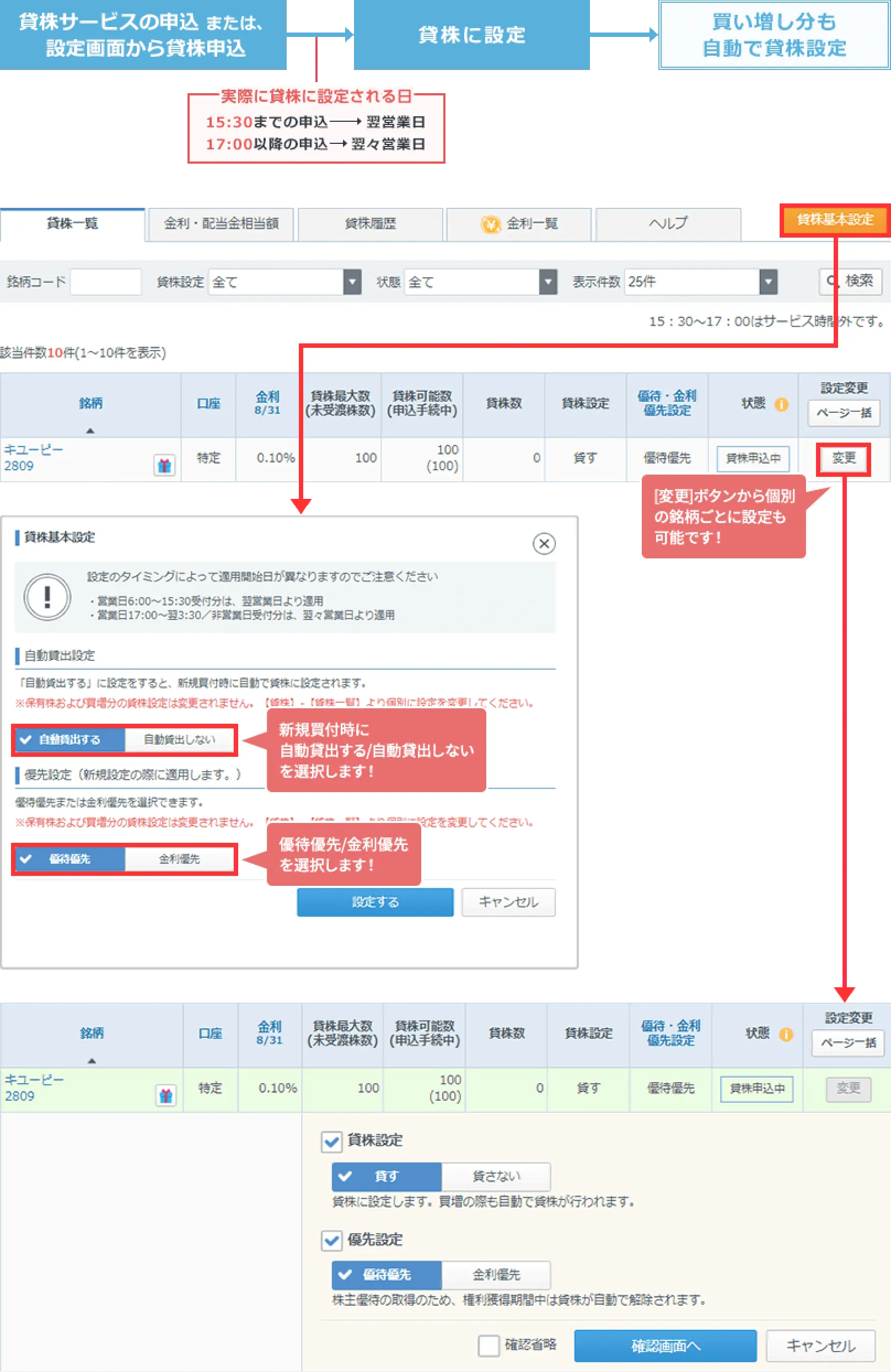 自動貸出のON/OFFは会員ページ【株式】-【貸株】-[貸株基本設定]から変更できます。