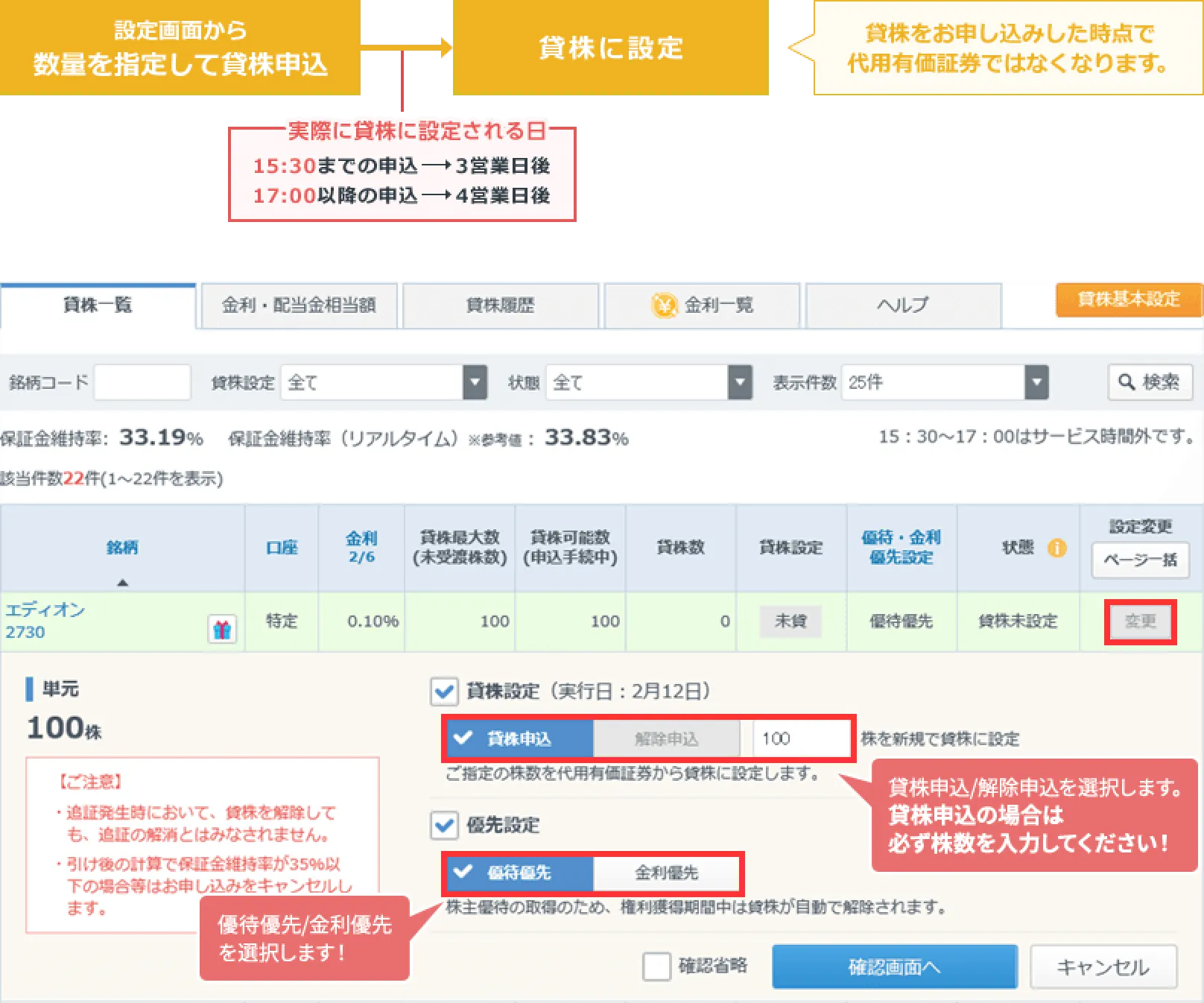 [貸株基本設定]-優先設定でのコース選択に関わらず、申込ごとに優先設定を選択してください。