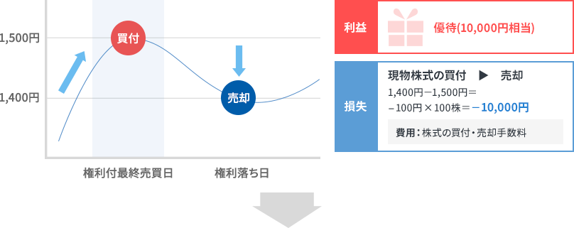 現物株を保有し株主優待を取得する場合、多くの投資家は権利落ち日に株を売ろうとするため、以降は株価が下がりやすくなる傾向があります。