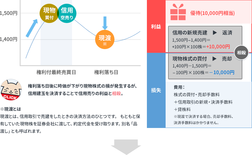 10,000円相当の優待を取得するために、時価1,500円の現物株式の買付と信用新規売りを100株実施した例