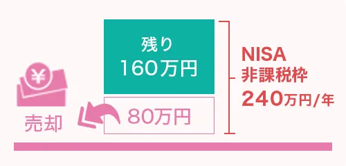 たとえば、NISA成長投資枠で80万円を途中で売却した場合、その年の非課税枠は残りの160万円(240万円-80万円)となります。