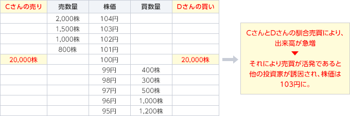 CさんとDさんは、ある上場会社株式の売買が活発なように見せかけて、他の投資家からの取引を誘い込み株価を変動させる目的で、あらかじめ約束したうえで、下表のように、Cさんは100円で20,000株の売り注文を発注し、同時期にDさんは100円で20,000株の買い注文を発注し約定させました。