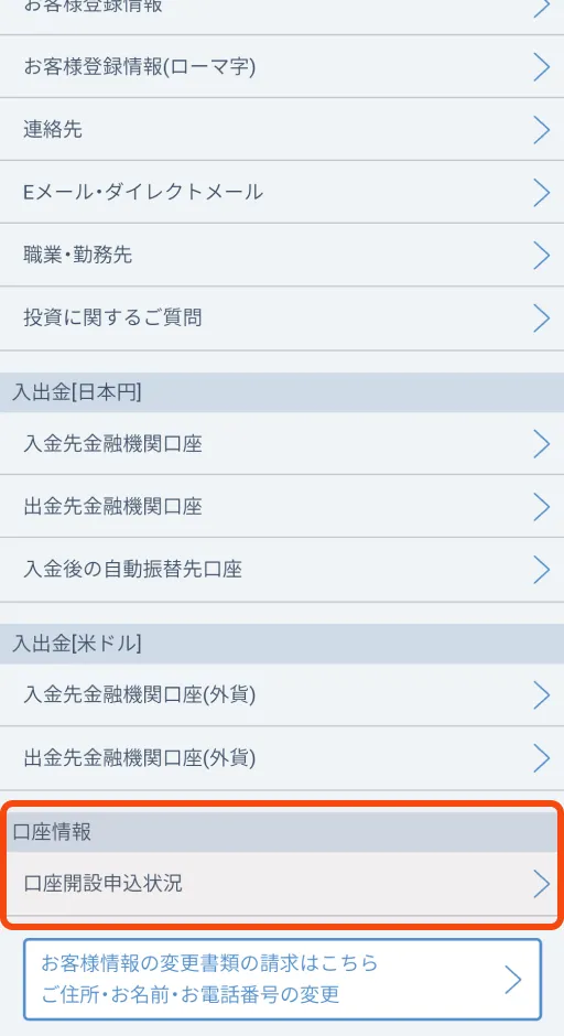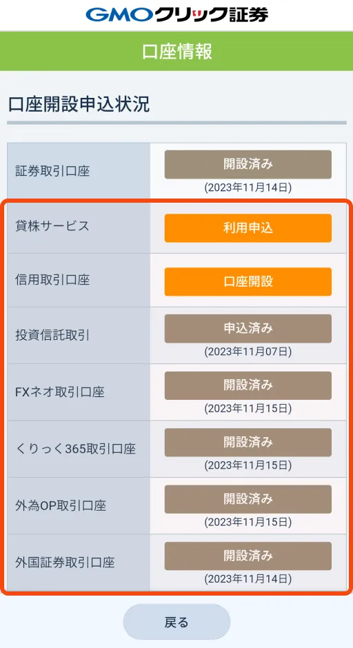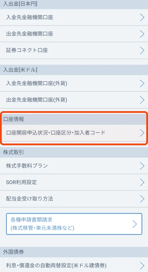 「登録情報・申請」 > 口座情報の「口座開設申込状況・口座区分・加入者コード」 > 各サービスの「口座開設」もしくは「利用申込」