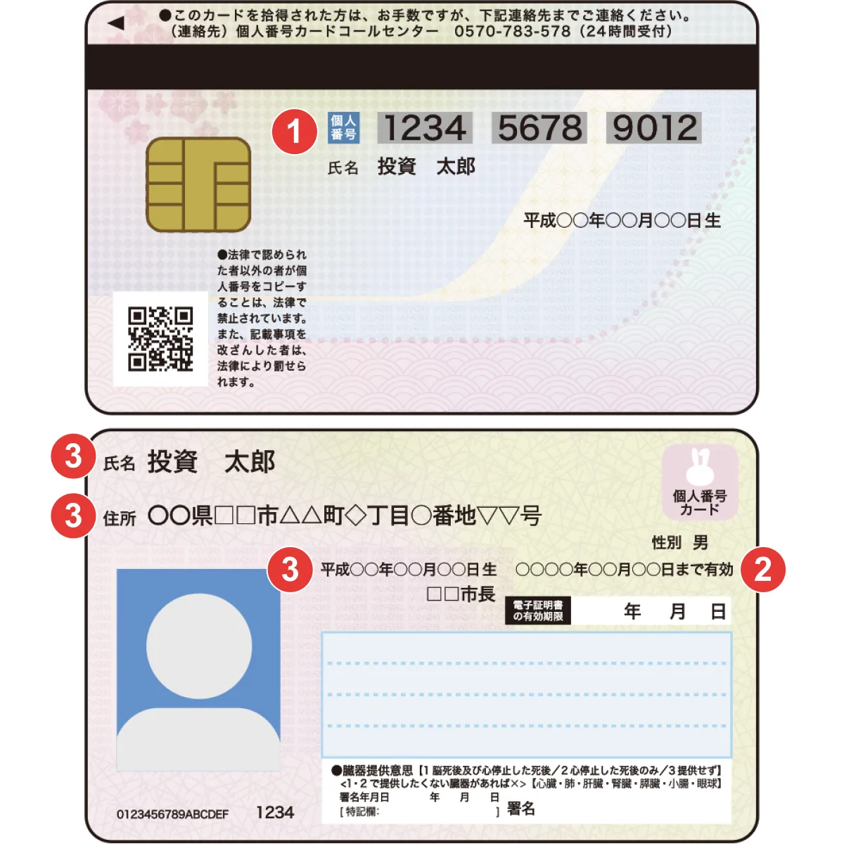 - 個人番号カード(マイナンバーカード)は1枚で本人確認書類(表面)とマイナンバー確認(裏面)としてご利用いただけます。マイナンバー確認が必要な手続きの場合は、必ず両面をご提出ください。