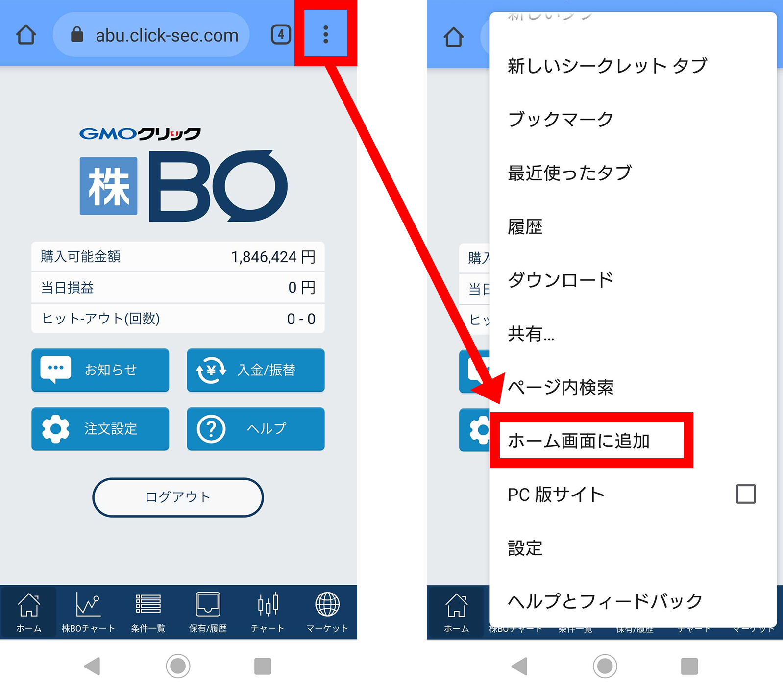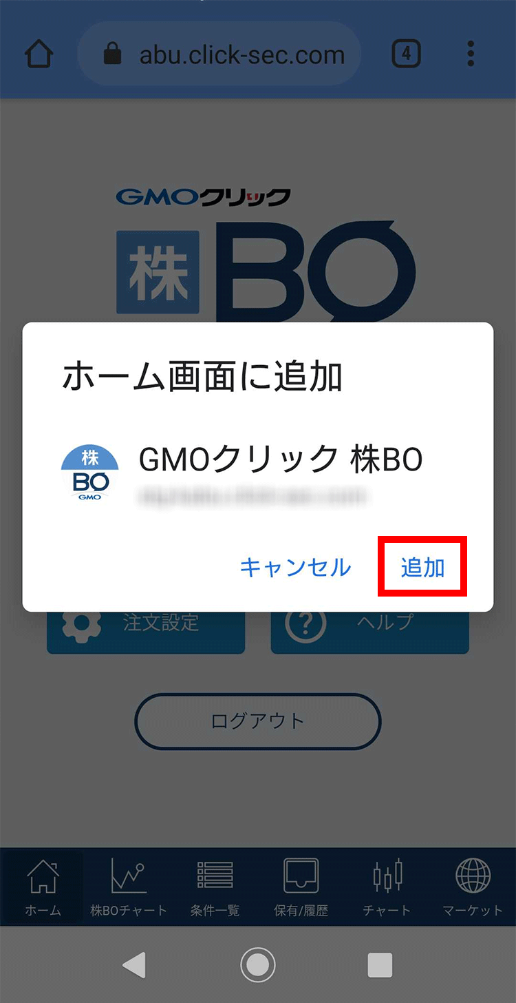 - ホーム画面に「GMOクリック 株BO」のアイコンが表示されます。