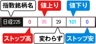 指数採用銘柄の動向(ストップ高安、値上り、値下り、変化なしの銘柄数)と、1銘柄分の株価指数を順次表示します。