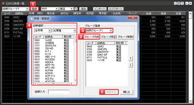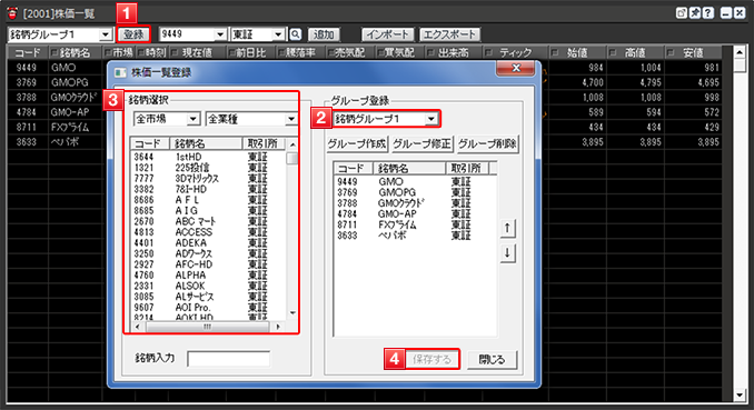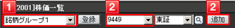 - 登録済み銘柄グループの選択、新しい銘柄グループの登録を行うことができます。