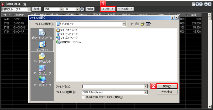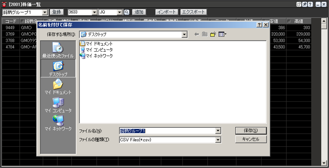 - CSVファイルを株価一覧に取り込むインポートと、株価一覧に登録している銘柄からCSVファイルを作成するエクスポートを行うことができます。