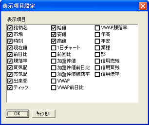 株価一覧画面の画面上で右クリックをし「列表示設定」を選択すると、「表示項目設定」画面が表示されます。