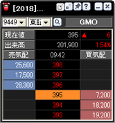 現在値、出来高、前日比、騰落率、気配値(上下3本)が表示されます。