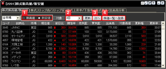 選択した対象期間中の高値/安値を当日に更新した銘柄を更新率順に表示します。
