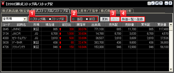 市場、ストップ高/ストップ安の別、当日/前日の別で、表示を絞り込むことができます。
