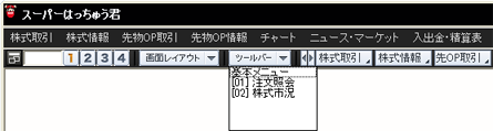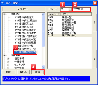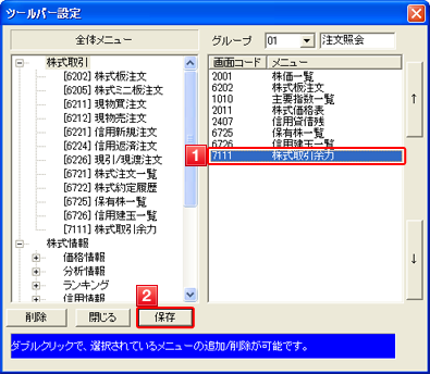 - 【設定】-【ツールバー設定】を開き、削除する画面をダブルクリックします。